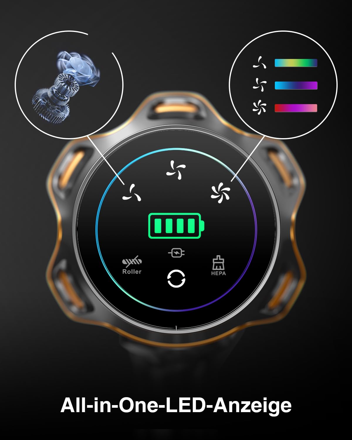 • 【HD-Farbiger LED-Display】 Das empfindliche Sensorsystem unterstützt das Berühren des Bildschirms zum Einstellen der Saugleistung und die einfachen, hochauflösenden und extragroßen Symbole sind sehr benutzerfreundlich für kurzsichtige Menschen sowie Menschen mittleren und höheren Alters. Das Smart Panel zeigt die verbleibende Leistung in Echtzeit an, damit Sie Ihre Reinigung besser planen können. Bei auftretenden Anomalien werden Sie durch Alarme daran erinnert, eine Wartung der Maschine durchzuführen. Jeder kann den Komfort und den Spaß der intelligenten Reinigung genießen!